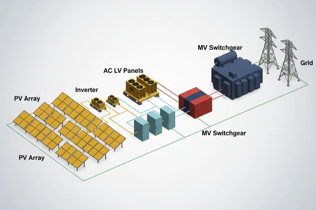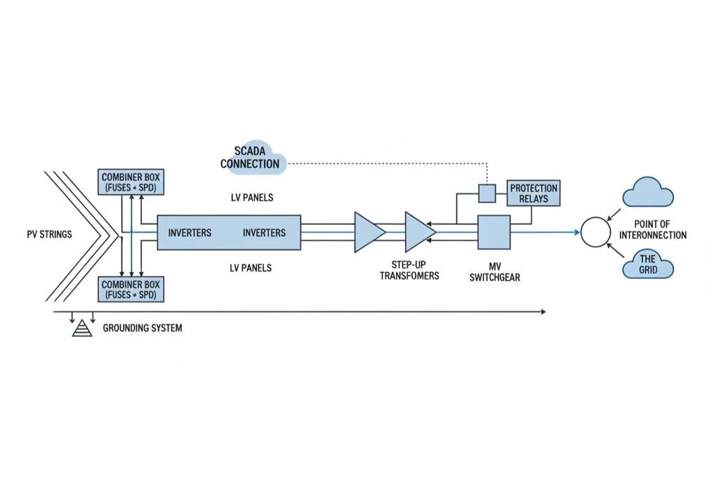 هدف: طراحی یکپارچه از ماژول تا نقطه اتصال به شبکه (POI) با تمرکز بر راندمان بالا، ایمنی، قابلیت اطمینان و انطباق با الزامات ساتبا و توانیر.